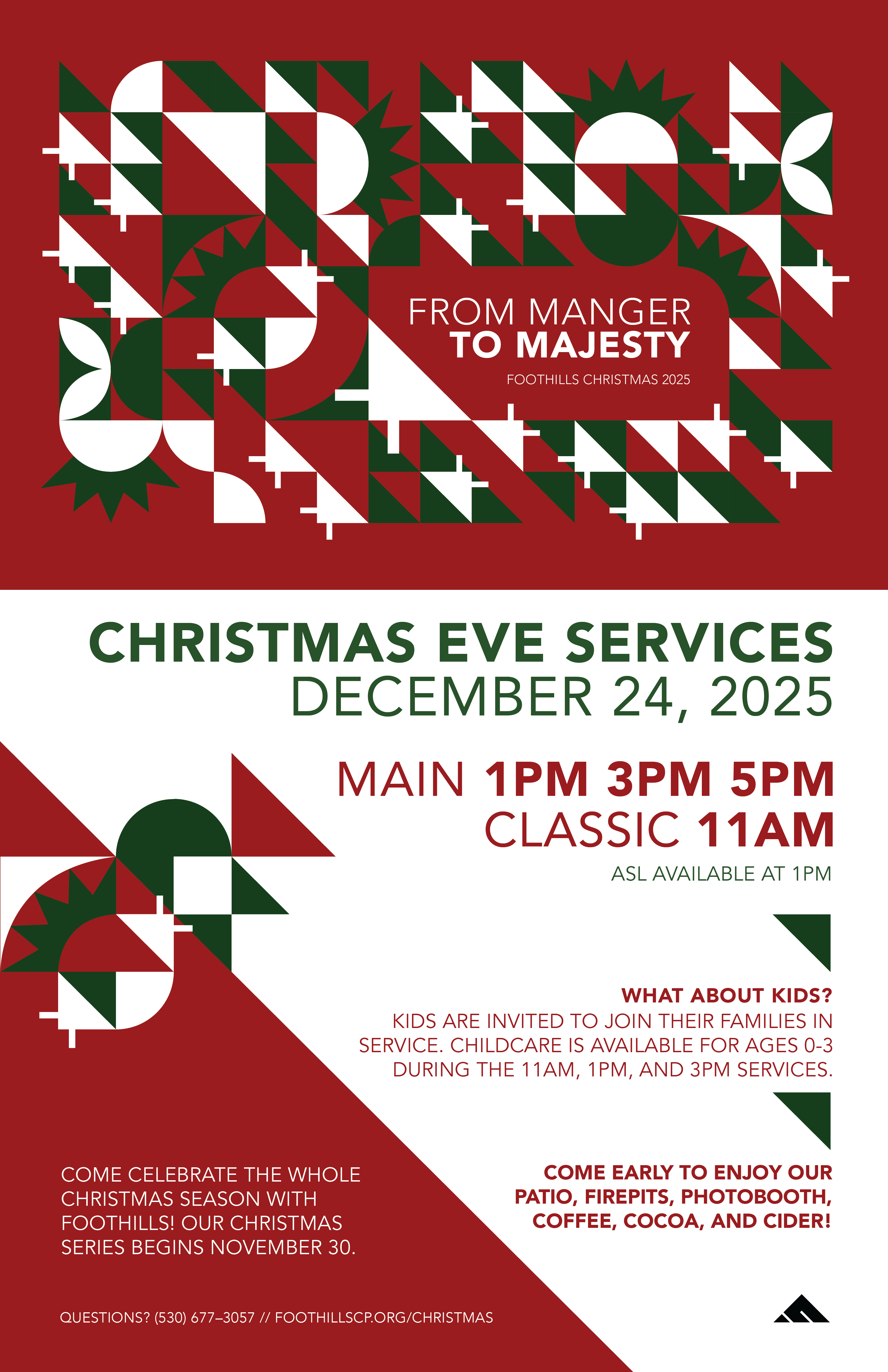 Come start the Christmas season with us at our Tree Lighting Concert. We'll be dazzled by local school choirs and our Foothills Kids Choir as they sing holiday favorites. Stay for hot chocolate and cookies and help countdown to light our big Christmas tree on the patio. Bring the whole family on December 7 at 6pm.